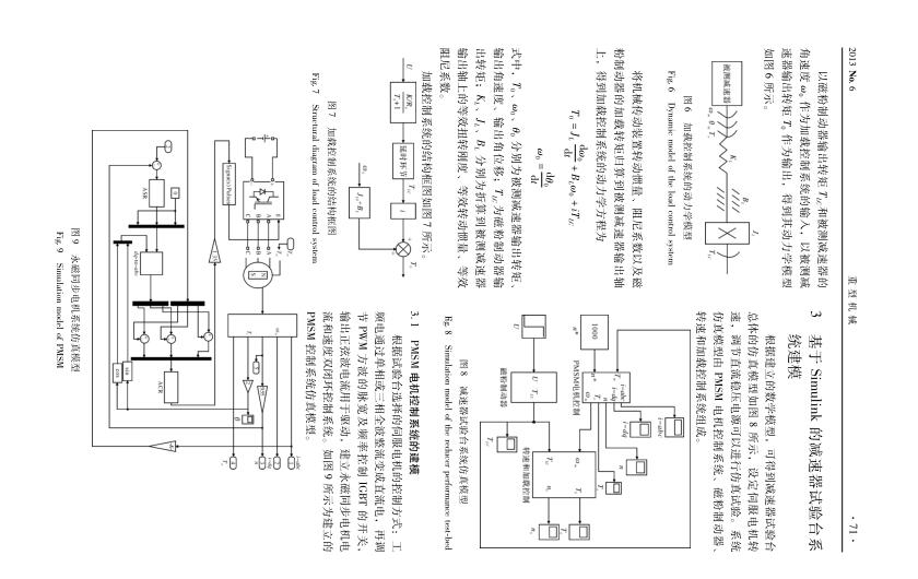 本文通過(guò)建立減速器性能測(cè)試試驗(yàn)臺(tái)各組成部分的數(shù)學(xué)模型 , 利用 Simulink 對(duì)系統(tǒng)仿真模型進(jìn)行過(guò)渡過(guò)程 、 空載和加載情況下的仿真試驗(yàn) ,得到仿真輸出曲線與實(shí)際情況相符 , 說(shuō)明所建立的系統(tǒng)數(shù)學(xué)模型的正確性 , 且建立的仿真模型有助于進(jìn)一步分析設(shè)計(jì)參數(shù)對(duì)系統(tǒng)性能的影響 , 也為減速器性能測(cè)試的試驗(yàn)研究提供理論依據(jù) 。