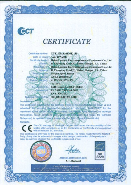 | 轉(zhuǎn)矩轉(zhuǎn)速傳感器CE證書 |