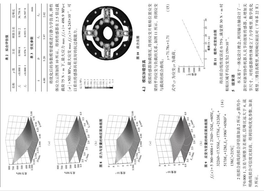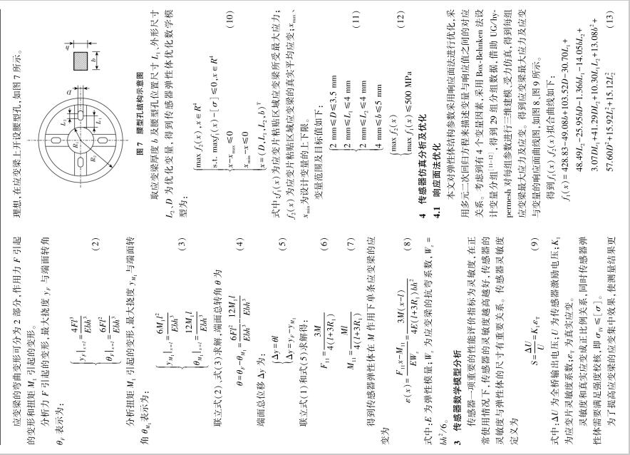 | 扭矩傳感器在機器人關節(jié)上的應用 為確保協(xié)作機器人的安全性,需要在協(xié)作機器人關節(jié)處安裝扭矩傳感器,由于協(xié)作機器人自身關節(jié)尺寸有限且負載比較小,需要一種結構緊湊、靈敏度高的扭矩傳感器。 為解決這一難題,在分析傳統(tǒng)輪輻式扭矩傳感器的基礎上,提出了一種機器人關節(jié)輸出軸和傳感器一體化的結構,對傳感器彈性體建立力學模型、數(shù)學模型,使用響應面法對彈性體結構參數(shù)進行優(yōu)化,根據(jù) Box⁃Behnken 法進行變量設計,然后利用 UG/ Hypermesh 進行有限元仿真驗證。 結果表明,優(yōu)化后的傳感器具有良好的抗過載能力、線性度及靈敏度。 Abstract:In order to ensure the safety of the collaborative robot,it is necessary to install torque sensors at the joints of thecollaborative robot.Torque sensors with compact size and high sensitivity are needed due to collaborative robot joint’s size limita⁃tion and small load.To solve this problem,an integrated structure of output shaft and sensor was proposed based on analysis of thetraditional cross⁃beam torque sensor.The mechanical model and mathematical model for the sensor were established.Response sur⁃face methodology was employed to optimize the sensor structural parameters.Variables were designed by Box⁃Behnken design. Then UG/ Hypermesh was used for finite element simulation verification.The results show the optimized sensor has good anti⁃over⁃load capability,linearity and sensitivity. 協(xié)作機器人作為新興產(chǎn)業(yè)代表 [1] ,被視為實現(xiàn)中國制造2025 的關鍵 [2-3] 。 協(xié)作機器人由于與人協(xié)同工作更強調安全性 [4] ,高靈敏的扭矩傳感器能夠準確測量機器人關節(jié)受力情況,從而確保足夠的安全性。 而如何獲得最優(yōu)的傳感器彈性體結構一直是設計難題 [5] 。 潘新安等通過將應變片粘貼在諧波減速器柔輪上測量扭矩,但是柔輪的噪聲對測量影響很大 [6] ;文獻[7]設計了“彈簧離合器”式傳感器,能減少關節(jié)的碰撞力;文獻[8]設計了一款異形體傳感器,靈敏度高但彈性體結構復雜難以加工;王羅羅等設計一款帶有保護梁的扭矩傳感器,測量應變梁的剪切應變,應變較小 [9] ;蔣聰?shù)葘嗇検浇Y構進行了優(yōu)化設計,加工性好但增加了關節(jié)軸向尺寸 [10] 。 本文在詳細分析傳統(tǒng)關節(jié)扭矩傳感器測量原理的基礎上,基于一體化設計理念,提出了扭矩傳感器與輸出軸一體化結構,降低了關節(jié)軸向尺寸,提高了關節(jié)負載/ 自重比。 同時,借助有限元仿真及響應面法,得到了一種扭矩傳感器彈性體的優(yōu)化方法。 1 扭矩傳感器需求分析及結構設計 1.1 傳感器需求分析 圖1 為新一代協(xié)作機器人的關節(jié)內部結構,即本文傳感器設計的應用對象。 由于關節(jié)外殼、諧波減速器已確定, 故 傳 感 器 最 大 外 徑 應 小 于 關 節(jié) 上 殼 內 徑(63.5 mm),內輪緣上螺栓圓中心線直徑為 27 mm,最大高度12 mm。 根據(jù)機械臂工況需求,扭矩傳感器量程為0~30 N·m,且具有2.5倍的抗過載能力,即傳感器能承受75 N·m 的瞬時載荷,載荷釋放后,傳感器仍可正常工作。 圖 1 協(xié)作機器人關節(jié)結構圖 1.2 傳感器整體設計 為最大程度減小關節(jié)尺寸,降低關節(jié)整體質量,采用一體化設計理念,將關節(jié)輸出軸與傳感器設計為一體,整體安裝示意圖如圖 2 所示。